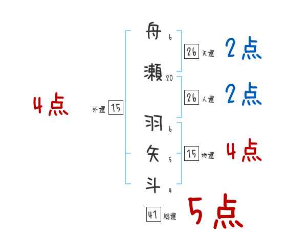 外運![]() | 舟瀬羽矢斗さんの外運は15画の4つ星!人徳があり出世する。順調に物事を進め円満な人生。 生活面を象徴する運勢です。外部から受ける影響力を表し、結婚運、家庭運や職場、環境への順応性を表します。 |