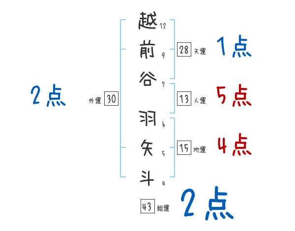 天運![]() | 越前谷羽矢斗さんの天運は28画の1つ星!家庭環境に注意。スポーツで活躍できる能力があるかも。 家系が持つ宿命的な運勢を表します。祖先から受け継いだ苗字ですので自分の力が及びません。家柄を象徴します。 |