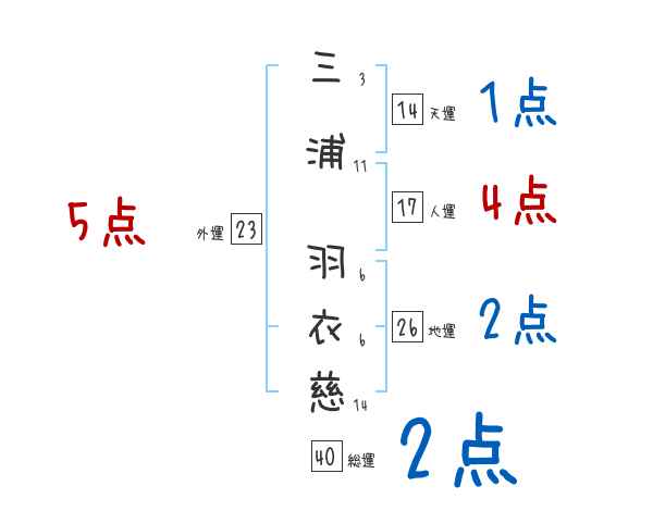 天運![]() | 三浦羽衣慈さんの天運は14画の1つ星!人に対して優しいがストレスを溜め込みがち。人間関係のトラブルを避けるよう気をつけましょう。 家系が持つ宿命的な運勢を表します。祖先から受け継いだ苗字ですので自分の力が及びません。家柄を象徴します。 |