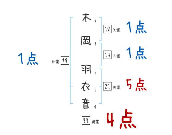 外運![]() | 木岡羽衣音さんの外運は19画の1つ星!優れた才能を持ちますが、協調性が足りないことも。周りの人と協力する事を意識しましょう。 生活面を象徴する運勢です。外部から受ける影響力を表し、結婚運、家庭運や職場、環境への順応性を表します。 |
