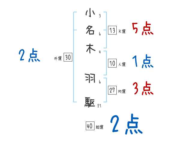 天運![]() | 小名木羽駆さんの天運は13画の5つ星!才能に恵まれ人気がある。名声を手に入れる。円満な人生。 家系が持つ宿命的な運勢を表します。祖先から受け継いだ苗字ですので自分の力が及びません。家柄を象徴します。 |