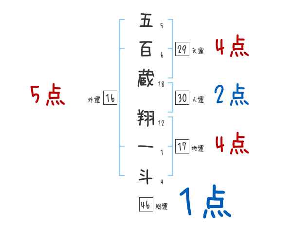 総運![]() | 五百蔵翔一斗さんの総運は46画の1つ星!迷走することが多く苦労するかも。目先のことにとらわれないように。 あなたの人生を表す1番重要な運勢です。生涯を通じて影響する総合運となり、主に50歳以降の晩年期に影響を及ぼします。 |