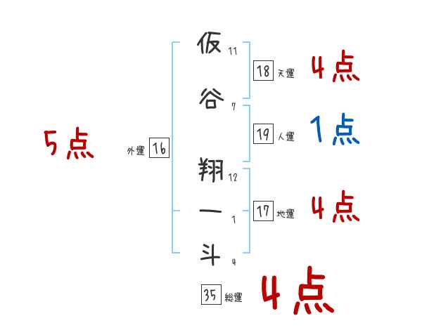 外運![]() | 仮谷翔一斗さんの外運は16画の5つ星!人望が厚く大きく発展する。逆転成功が見える。 生活面を象徴する運勢です。外部から受ける影響力を表し、結婚運、家庭運や職場、環境への順応性を表します。 |