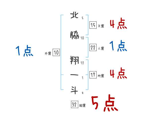 | 総運  | 北脇翔一斗さんの総運は32画の5つ星!柔軟性があり成功する。チャンスが多く金運が良い。あなたの人生を表す1番重要な運勢です。生涯を通じて影響する総合運となり、主に50歳以降の晩年期に影響を及ぼします。 |