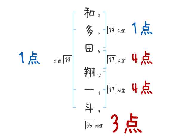 総運![]() | 和多田翔一斗さんの総運は36画の3つ星!先見性が豊かです。多少神経質で苦労することも。 あなたの人生を表す1番重要な運勢です。生涯を通じて影響する総合運となり、主に50歳以降の晩年期に影響を及ぼします。 |