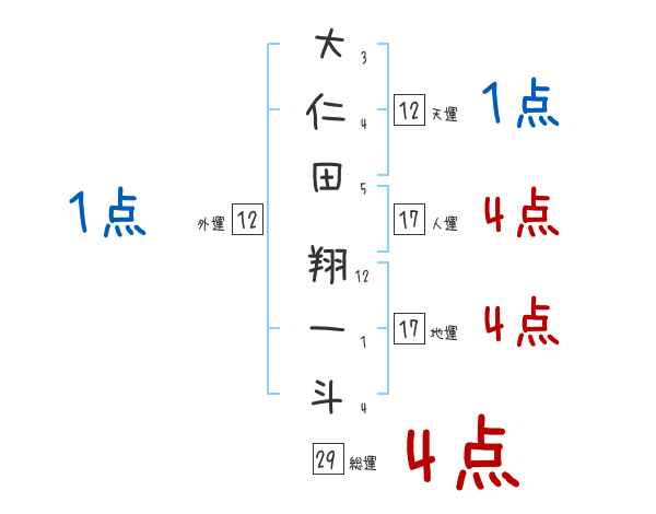 天運![]() | 大仁田翔一斗さんの天運は12画の1つ星!簡単な失敗で諦めてしまいやすいかも。着実に行動すると良いでしょう。 家系が持つ宿命的な運勢を表します。祖先から受け継いだ苗字ですので自分の力が及びません。家柄を象徴します。 |