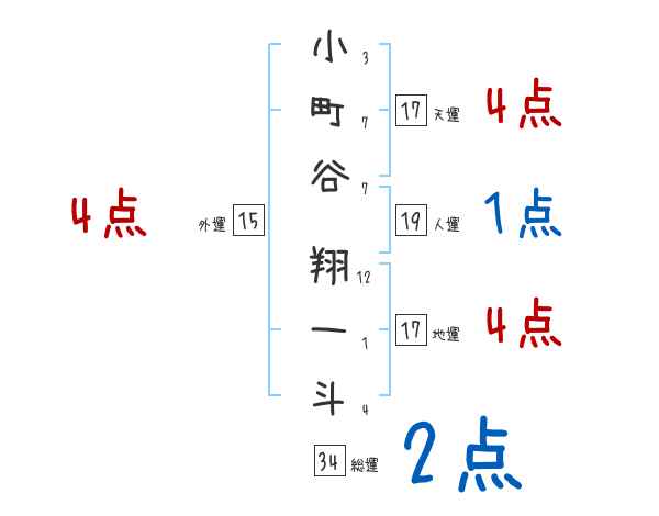 天運![]() | 小町谷翔一斗さんの天運は17画の4つ星!積極的な行動力。地位を気づき財産を手に入れる。純粋な心と直感力。 家系が持つ宿命的な運勢を表します。祖先から受け継いだ苗字ですので自分の力が及びません。家柄を象徴します。 |
