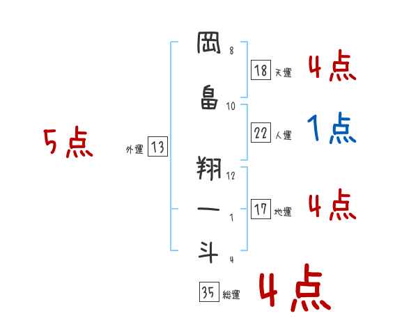 外運![]() | 岡畠翔一斗さんの外運は13画の5つ星!才能に恵まれ人気がある。名声を手に入れる。円満な人生。 生活面を象徴する運勢です。外部から受ける影響力を表し、結婚運、家庭運や職場、環境への順応性を表します。 |