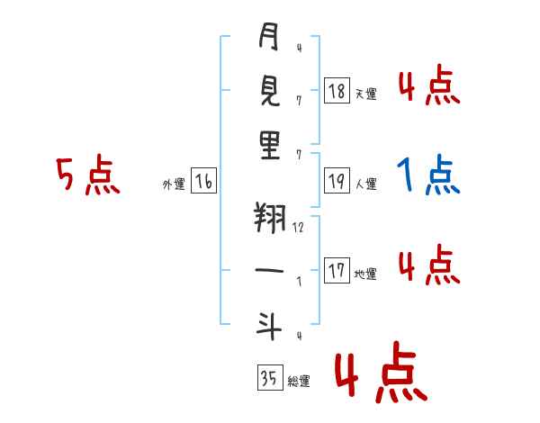 外運![]() | 月見里翔一斗さんの外運は16画の5つ星!人望が厚く大きく発展する。逆転成功が見える。 生活面を象徴する運勢です。外部から受ける影響力を表し、結婚運、家庭運や職場、環境への順応性を表します。 |