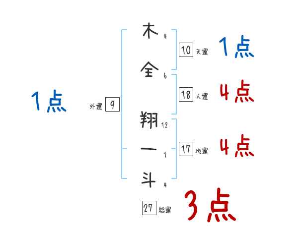 天運![]() | 木全翔一斗さんの天運は10画の1つ星!不安を感じやすい傾向。ストレスを抱えないように注意しましょう。 家系が持つ宿命的な運勢を表します。祖先から受け継いだ苗字ですので自分の力が及びません。家柄を象徴します。 |