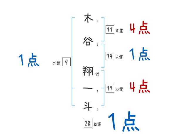 総運![]() | 木谷翔一斗さんの総運は28画の1つ星!家庭環境に注意。スポーツで活躍できる能力があるかも。 あなたの人生を表す1番重要な運勢です。生涯を通じて影響する総合運となり、主に50歳以降の晩年期に影響を及ぼします。 |