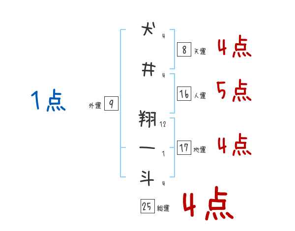 天運![]() | 犬井翔一斗さんの天運は8画の4つ星!勤勉家。根気強く努力し成功する。忍耐力がある。 家系が持つ宿命的な運勢を表します。祖先から受け継いだ苗字ですので自分の力が及びません。家柄を象徴します。 |