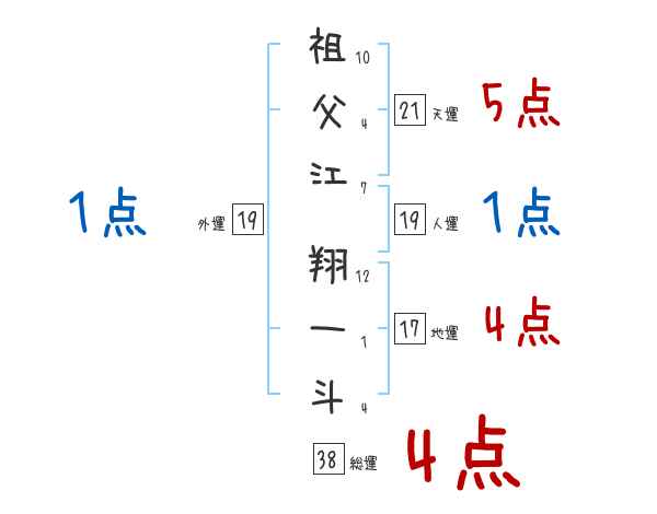 祖父江翔一斗さんの総運は38画の4つ星