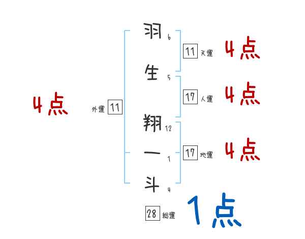 総運![]() | 羽生翔一斗さんの総運は28画の1つ星!家庭環境に注意。スポーツで活躍できる能力があるかも。 あなたの人生を表す1番重要な運勢です。生涯を通じて影響する総合運となり、主に50歳以降の晩年期に影響を及ぼします。 |