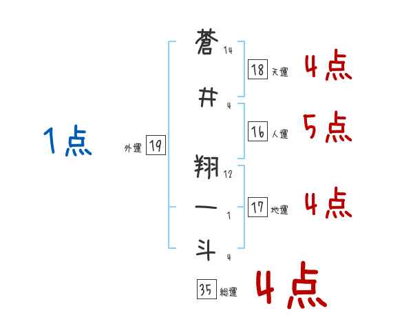 総運![]() | 蒼井翔一斗さんの総運は35画の4つ星!温厚な性格で感受性が高い。穏和な性格で人望が厚い。 あなたの人生を表す1番重要な運勢です。生涯を通じて影響する総合運となり、主に50歳以降の晩年期に影響を及ぼします。 |