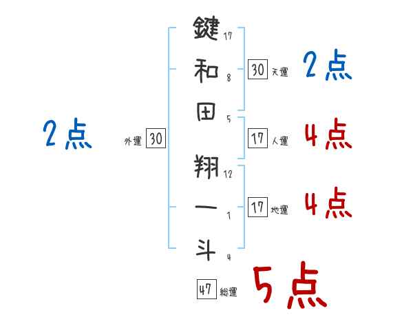 天運![]() | 鍵和田翔一斗さんの天運は30画の2つ星!浮き沈みの激しさに注意しましょう。 家系が持つ宿命的な運勢を表します。祖先から受け継いだ苗字ですので自分の力が及びません。家柄を象徴します。 |