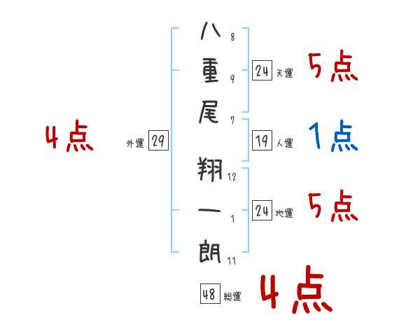 天運![]() | 八重尾翔一朗さんの天運は24画の5つ星!家庭運が良く順調な人生。金運にも恵まれる。 家系が持つ宿命的な運勢を表します。祖先から受け継いだ苗字ですので自分の力が及びません。家柄を象徴します。 |