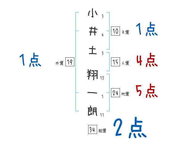 総運![]() | 小井土翔一朗さんの総運は34画の2つ星!独創性に優れるが、自尊心が強く災難に注意しましょう。 あなたの人生を表す1番重要な運勢です。生涯を通じて影響する総合運となり、主に50歳以降の晩年期に影響を及ぼします。 |