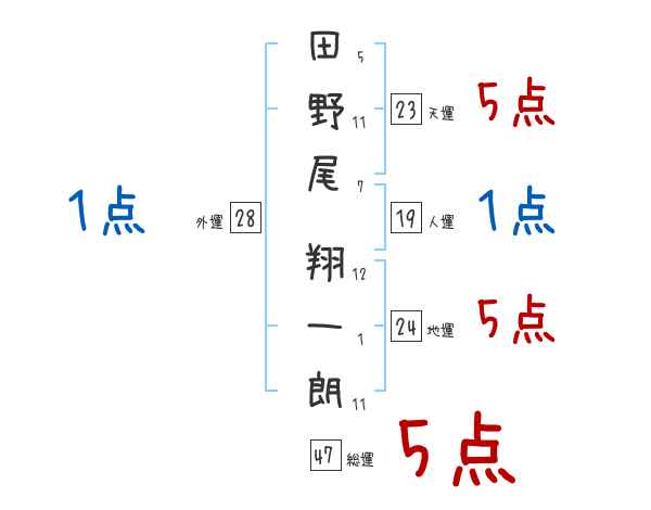 天運![]() | 田野尾翔一朗さんの天運は23画の5つ星!想像力に優れ活力がある。一代で成功し名誉を手に入れる。 家系が持つ宿命的な運勢を表します。祖先から受け継いだ苗字ですので自分の力が及びません。家柄を象徴します。 |