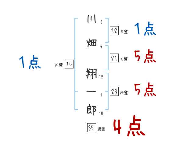 天運![]() | 川畑翔一郎さんの天運は12画の1つ星!簡単な失敗で諦めてしまいやすいかも。着実に行動すると良いでしょう。 家系が持つ宿命的な運勢を表します。祖先から受け継いだ苗字ですので自分の力が及びません。家柄を象徴します。 |