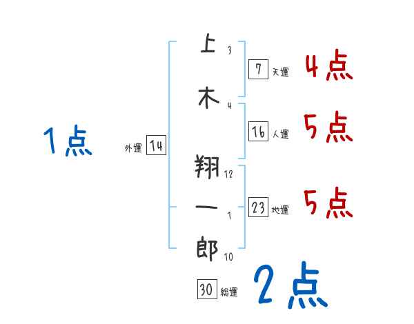 外運![]() | 上木翔一郎さんの外運は14画の1つ星!人に対して優しいがストレスを溜め込みがち。人間関係のトラブルを避けるよう気をつけましょう。 生活面を象徴する運勢です。外部から受ける影響力を表し、結婚運、家庭運や職場、環境への順応性を表します。 |