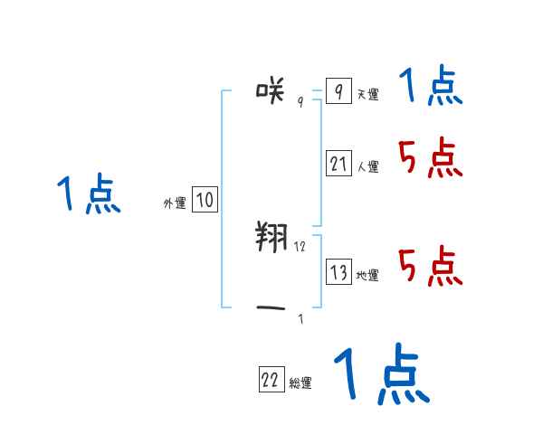 総運![]() | 咲翔一さんの総運は22画の1つ星!努力することが苦手ないっぽう手先が器用。芸術性にも優れる。 あなたの人生を表す1番重要な運勢です。生涯を通じて影響する総合運となり、主に50歳以降の晩年期に影響を及ぼします。 |