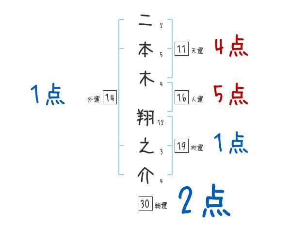 人運![]() | 二本木翔之介さんの人運は16画の5つ星!人望が厚く大きく発展する。逆転成功が見える。 性格や才能などを表す2番目に重要な運勢です。人間関係や協調性、社会的な成功に影響します。主に20歳から50歳ぐらいまでの中年期の運勢を表します。 |