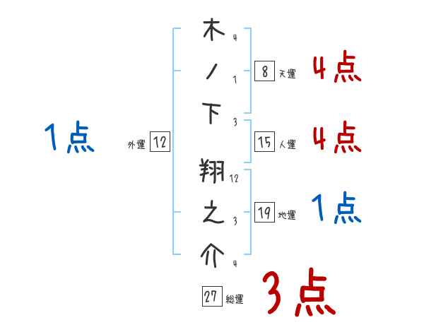 | 天運  | 木ノ下翔之介さんの天運は8画の4つ星!勤勉家。根気強く努力し成功する。忍耐力がある。家系が持つ宿命的な運勢を表します。祖先から受け継いだ苗字ですので自分の力が及びません。家柄を象徴します。 |