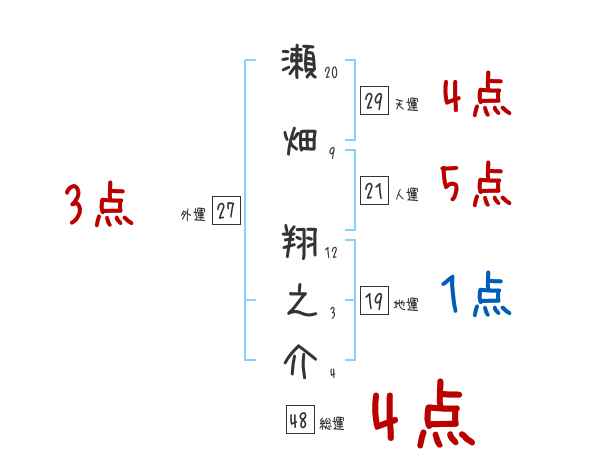 総運![]() | 瀬畑翔之介さんの総運は48画の4つ星!賢明な性格で人望が厚い。指導力があり多くの人に尊敬される。 あなたの人生を表す1番重要な運勢です。生涯を通じて影響する総合運となり、主に50歳以降の晩年期に影響を及ぼします。 |