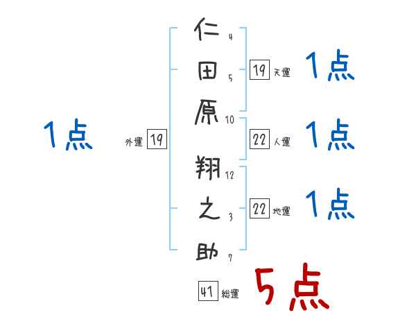 外運![]() | 仁田原翔之助さんの外運は19画の1つ星!優れた才能を持ちますが、協調性が足りないことも。周りの人と協力する事を意識しましょう。 生活面を象徴する運勢です。外部から受ける影響力を表し、結婚運、家庭運や職場、環境への順応性を表します。 |