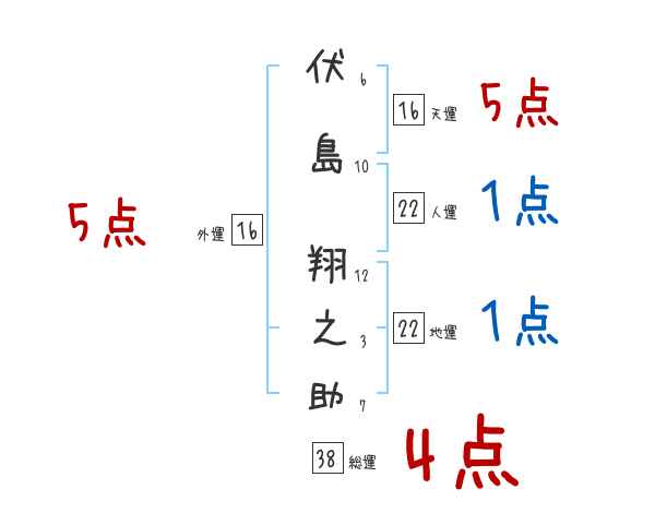 外運![]() | 伏島翔之助さんの外運は16画の5つ星!人望が厚く大きく発展する。逆転成功が見える。 生活面を象徴する運勢です。外部から受ける影響力を表し、結婚運、家庭運や職場、環境への順応性を表します。 |
