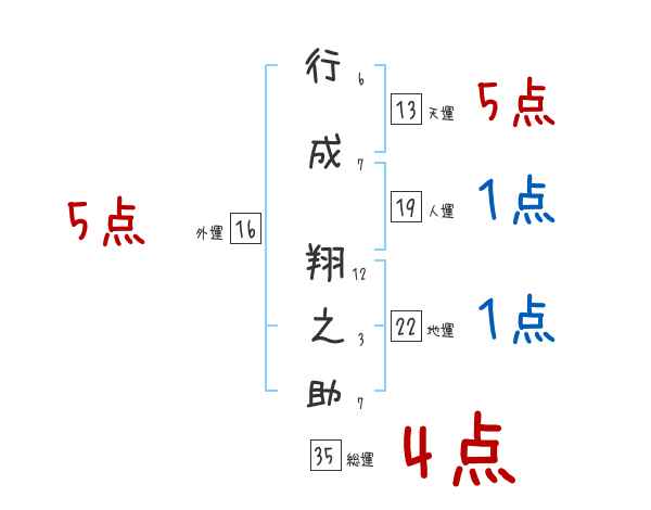 外運![]() | 行成翔之助さんの外運は16画の5つ星!人望が厚く大きく発展する。逆転成功が見える。 生活面を象徴する運勢です。外部から受ける影響力を表し、結婚運、家庭運や職場、環境への順応性を表します。 |