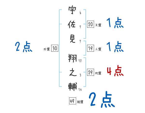 総運![]() | 宇佐見翔之輔さんの総運は49画の2つ星!不安定な性格で明暗がある人生。周りの人には支援されやすい。 あなたの人生を表す1番重要な運勢です。生涯を通じて影響する総合運となり、主に50歳以降の晩年期に影響を及ぼします。 |