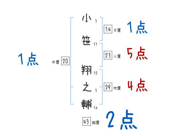 天運![]() | 小笹翔之輔さんの天運は14画の1つ星!人に対して優しいがストレスを溜め込みがち。人間関係のトラブルを避けるよう気をつけましょう。 家系が持つ宿命的な運勢を表します。祖先から受け継いだ苗字ですので自分の力が及びません。家柄を象徴します。 |