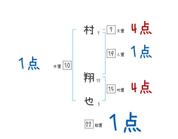 天運![]() | 村翔也さんの天運は7画の4つ星!強い意志や信念を持ち独立心が強い。自立する。 家系が持つ宿命的な運勢を表します。祖先から受け継いだ苗字ですので自分の力が及びません。家柄を象徴します。 |