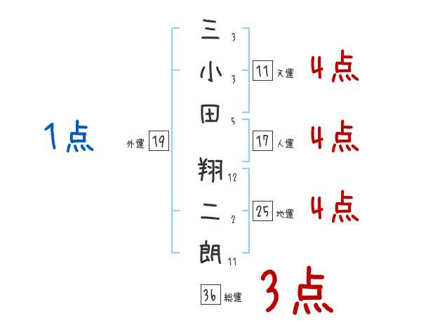 総運![]() | 三小田翔二朗さんの総運は36画の3つ星!先見性が豊かです。多少神経質で苦労することも。 あなたの人生を表す1番重要な運勢です。生涯を通じて影響する総合運となり、主に50歳以降の晩年期に影響を及ぼします。 |
