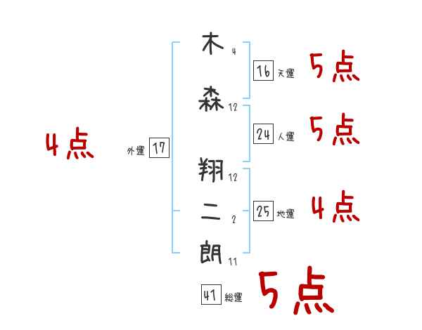 外運![]() | 木森翔二朗さんの外運は17画の4つ星!積極的な行動力。地位を気づき財産を手に入れる。純粋な心と直感力。 生活面を象徴する運勢です。外部から受ける影響力を表し、結婚運、家庭運や職場、環境への順応性を表します。 |