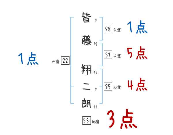外運![]() | 皆藤翔二朗さんの外運は22画の1つ星!努力することが苦手ないっぽう手先が器用。芸術性にも優れる。 生活面を象徴する運勢です。外部から受ける影響力を表し、結婚運、家庭運や職場、環境への順応性を表します。 |