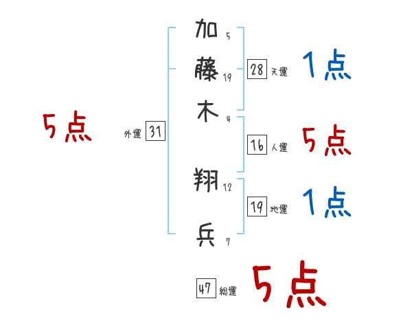 天運![]() | 加藤木翔兵さんの天運は28画の1つ星!家庭環境に注意。スポーツで活躍できる能力があるかも。 家系が持つ宿命的な運勢を表します。祖先から受け継いだ苗字ですので自分の力が及びません。家柄を象徴します。 |