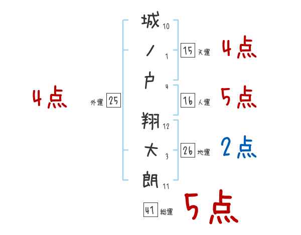 天運![]() | 城ノ戸翔大朗さんの天運は15画の4つ星!人徳があり出世する。順調に物事を進め円満な人生。 家系が持つ宿命的な運勢を表します。祖先から受け継いだ苗字ですので自分の力が及びません。家柄を象徴します。 |