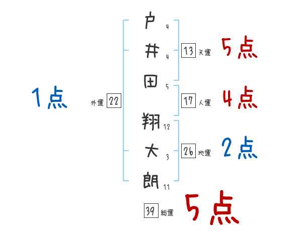 天運![]() | 戸井田翔大朗さんの天運は13画の5つ星!才能に恵まれ人気がある。名声を手に入れる。円満な人生。 家系が持つ宿命的な運勢を表します。祖先から受け継いだ苗字ですので自分の力が及びません。家柄を象徴します。 |