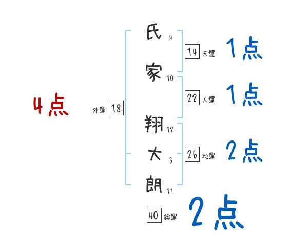 外運![]() | 氏家翔大朗さんの外運は18画の4つ星!情熱的で剛気。忍耐力があり信頼される。 生活面を象徴する運勢です。外部から受ける影響力を表し、結婚運、家庭運や職場、環境への順応性を表します。 |