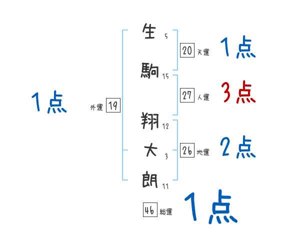 総運![]() | 生駒翔大朗さんの総運は46画の1つ星!迷走することが多く苦労するかも。目先のことにとらわれないように。 あなたの人生を表す1番重要な運勢です。生涯を通じて影響する総合運となり、主に50歳以降の晩年期に影響を及ぼします。 |