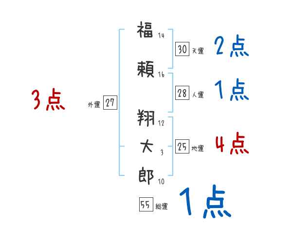 天運![]() | 福頼翔大郎さんの天運は30画の2つ星!浮き沈みの激しさに注意しましょう。 家系が持つ宿命的な運勢を表します。祖先から受け継いだ苗字ですので自分の力が及びません。家柄を象徴します。 |