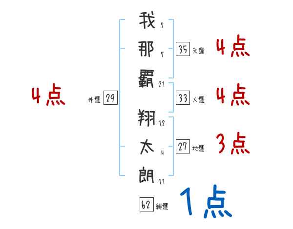 天運![]() | 我那覇翔太朗さんの天運は35画の4つ星!温厚な性格で感受性が高い。穏和な性格で人望が厚い。 家系が持つ宿命的な運勢を表します。祖先から受け継いだ苗字ですので自分の力が及びません。家柄を象徴します。 |