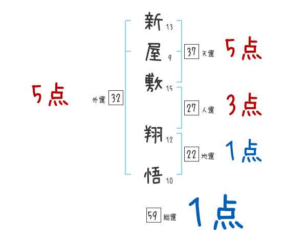 外運![]() | 新屋敷翔悟さんの外運は32画の5つ星!柔軟性があり成功する。チャンスが多く金運が良い。 生活面を象徴する運勢です。外部から受ける影響力を表し、結婚運、家庭運や職場、環境への順応性を表します。 |