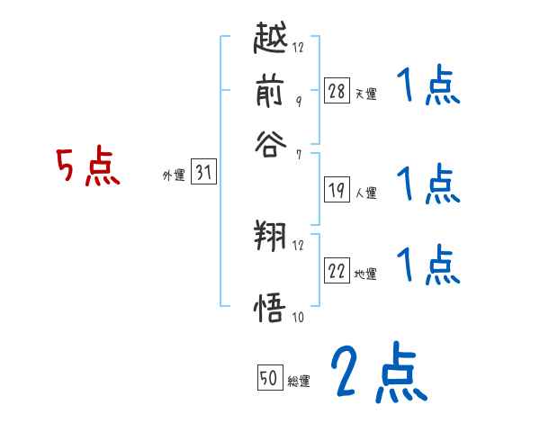 天運![]() | 越前谷翔悟さんの天運は28画の1つ星!家庭環境に注意。スポーツで活躍できる能力があるかも。 家系が持つ宿命的な運勢を表します。祖先から受け継いだ苗字ですので自分の力が及びません。家柄を象徴します。 |