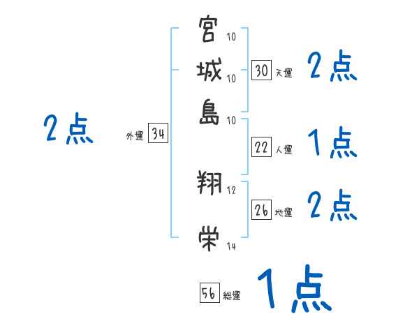 人運![]() | 宮城島翔栄さんの人運は22画の1つ星!努力することが苦手ないっぽう手先が器用。芸術性にも優れる。 性格や才能などを表す2番目に重要な運勢です。人間関係や協調性、社会的な成功に影響します。主に20歳から50歳ぐらいまでの中年期の運勢を表します。 |