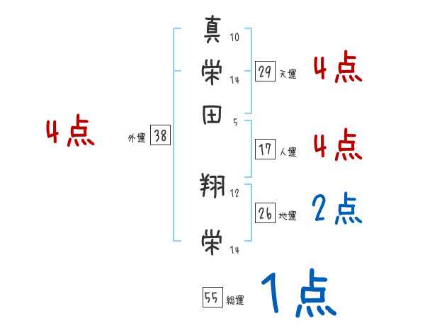 天運![]() | 真栄田翔栄さんの天運は29画の4つ星!完全主義で才能がある。厳格な心の持ち主。 家系が持つ宿命的な運勢を表します。祖先から受け継いだ苗字ですので自分の力が及びません。家柄を象徴します。 |
