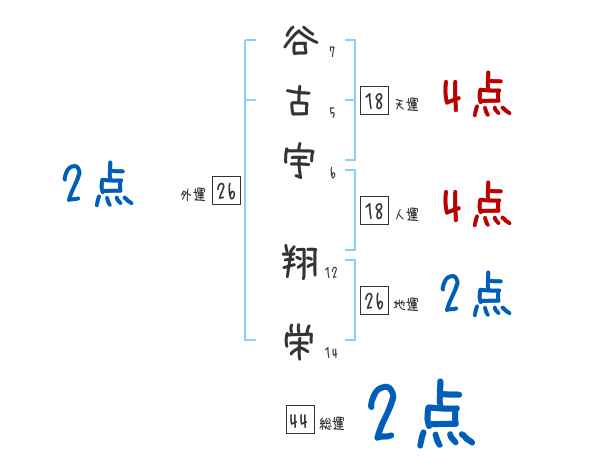 天運![]() | 谷古宇翔栄さんの天運は18画の4つ星!情熱的で剛気。忍耐力があり信頼される。 家系が持つ宿命的な運勢を表します。祖先から受け継いだ苗字ですので自分の力が及びません。家柄を象徴します。 |